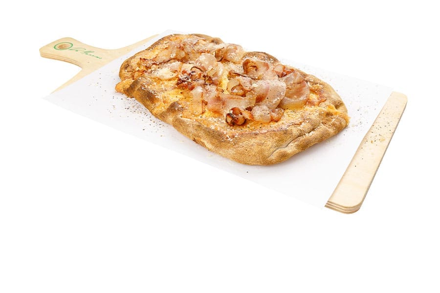 Пинса с моцарела Фиор ди Лате, гуанчале – зряла свинска буза, жълтък и черен пипер, Пармиджано Реджано – 1, 3, 7